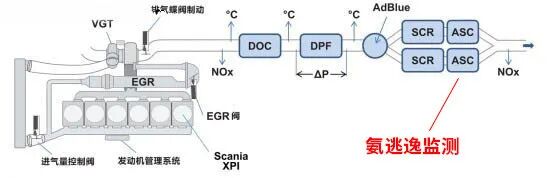 看上面兩幅圖,可以看出國五的后處理系統有SCR,國六的后處理系統除了SCR外,還多了ASC、DPF、DOC三大裝置,(其中SCR為選擇性催化還原,DOC為氧化型催化器、DPF為壁流式顆粒捕集器、ASC為氨氣氧化催化器)。